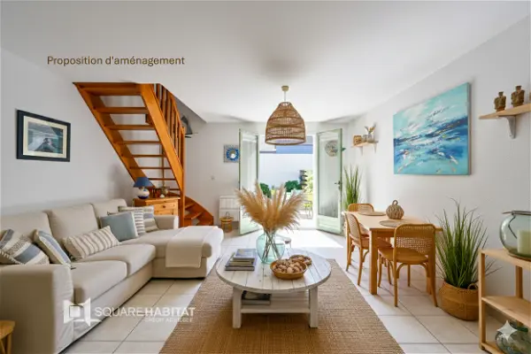 A proximité du centre-ville et des plages, maison de 41 m², avec en son rez-de-chaussée, une cuisine ouverte sur le séjour, WC, et à l'étage deux chambres et une salle d'eau avec wc. Terrasse et jardin sud-est. Petit cagibi buanderie.