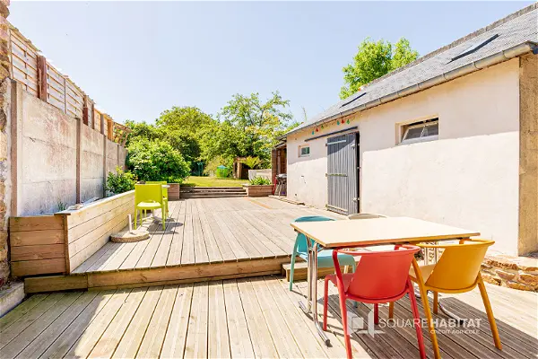 Coté extérieur, l'atout majeur de la maison, nous disposons d'une belle terrasse bien exposée (sud ouest) avec un grand jardin privatif au calme et d'une dépendance servant d'abri de jardin.