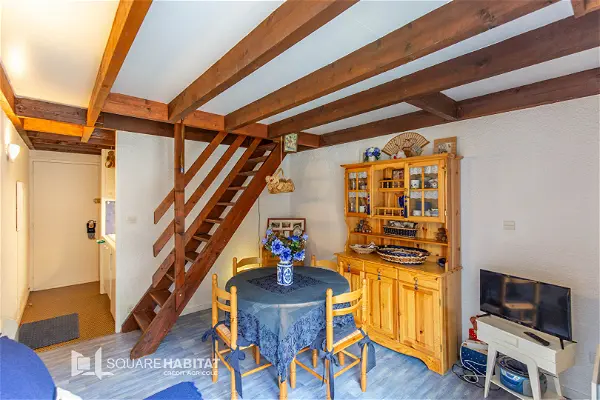 Dans une copropriété bien entretenue de Barèges, Appartement de Type 2 composé au premier niveau d'une entrée, une kitchenette, salon-séjour, salle de bains avec WC. Au dernier niveau, une mezzanine avec une chambre.
