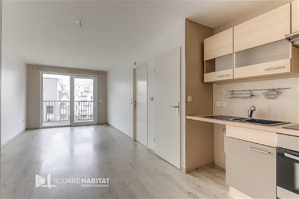 Appartement de type 2 situé dans une résidence récente, offrant une pièce de vie avec cuisine équipée, salle de bains (douche, vasque, WC), chambre.