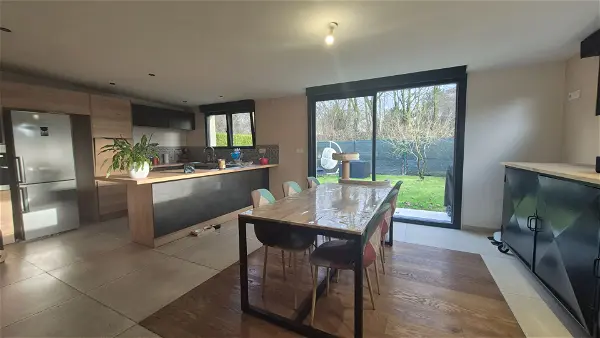 Elle se compose d'un vaste séjour lumineux équipé d'un poêle à granulés, d'une cuisine équipée semi-ouverte, ainsi qu'une véranda apportant un bel espace supplémentaire servant de salle à manger.