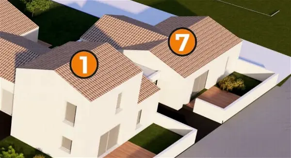 Trois logements de type T3 espace de vie salon séjour cuisine WC deux chambres salle de bains WC à l'étage.