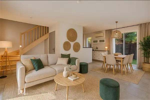 Grande pièce de vie lumineuse ouverte sur une cuisine aménagée et équipée