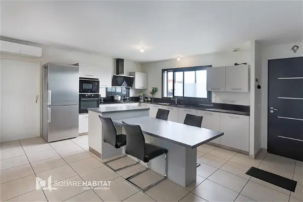 Une cuisine équipée moderne, fonctionnelle et semi-ouverte sur la vie familiale.