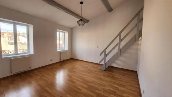ccVIENNE - Centre-ville (Cours Brillier) - Appartement atypique à louer de 59m² habitables et 79m² utiles, au 4éme et dernier étage sans ascenseur. Ce logement en duplex de 3 pièces est composée d'un salon, une cuisine, 2 chambres sous combles, une salle de bains et toilettes séparés. Disponible immédiatement.