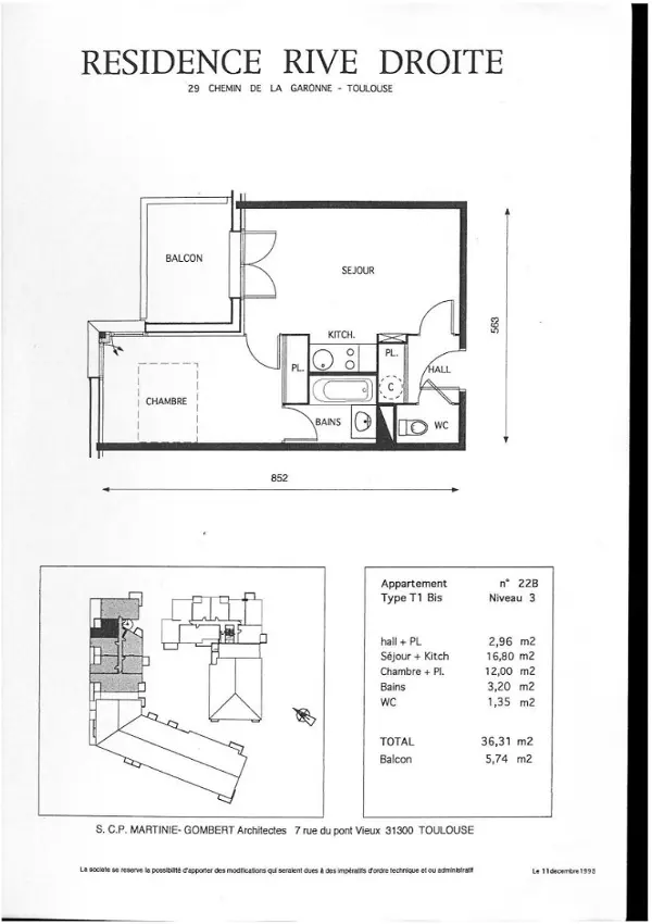 ccsept deniers-Dans résidence au calme, proche de la Garonne, appartement de type T1bis de 36.31m² comprenant une entrée avec placard et WC, séjour avec kitchenette équipée, balcon, chambre avec salle d'eau attenante, parking-
