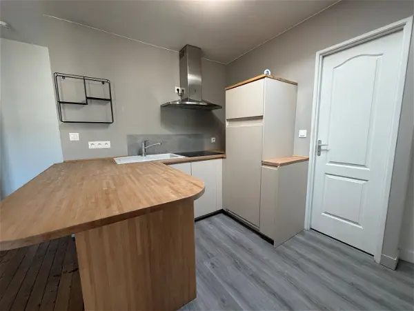 ccORLEANS - QUARTIER ST JEAN - Un appartement de type 3 comprenant une entrée, une pièce de vie avec cheminée décorative, une cuisine ouverte aménagée et équipée (hotte, plaques, réfrigérateur), deux chambres avec placards, salle d'eau et WC.
