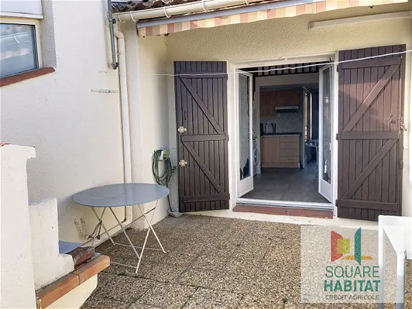 ccST CYPRIEN PLAGE Petite maison MEUBLEE en 2 faces composée d'un séjour avec cuisine ouverte équipée (plan de cuisson, hotte, micro-onde, four, réfrigérateur congélateur, meubles) un bureau avec placard, salle d'eau, toilette et au premier étage une mezzanine mansardée. (non comptabilisé en surface habitable) La maison dispose d'une petite cours à l'avant et d'une place de parking extérieure.