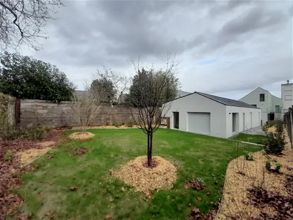 ccCHEMILLE Plain-pied : pièce de vie ouverte sur cuisine aménagée, 3 chambres, salle de bains (baignoire+ douche), wc, garage. Jardin avec terrasse. Chauffage électrique au sol.